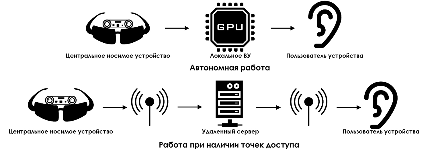 Программно-аппаратный комплекс представлен в виде комплекса носимых устройств для лиц с инвалидностью или ограниченными возможностями здоровья по зрению. Центральное носимое устройство представляет собой очки со встроенными стереокамерой и стереонаушниками, а также вычислительный модуль, основанный на графическом процессоре Nvidia Jetson TX1. Устройство способно вести построение карты глубины в режиме реального времени для передачи пользователю информации о глубине пространства тактильно-звуковым методом. Устройство при помощи свёрточных нейронных сетей способно вести распознавание важных для пользователя элементов быта. Полученная информация об объекте передается пользователю устройства при помощи настроенного голосового модуля.